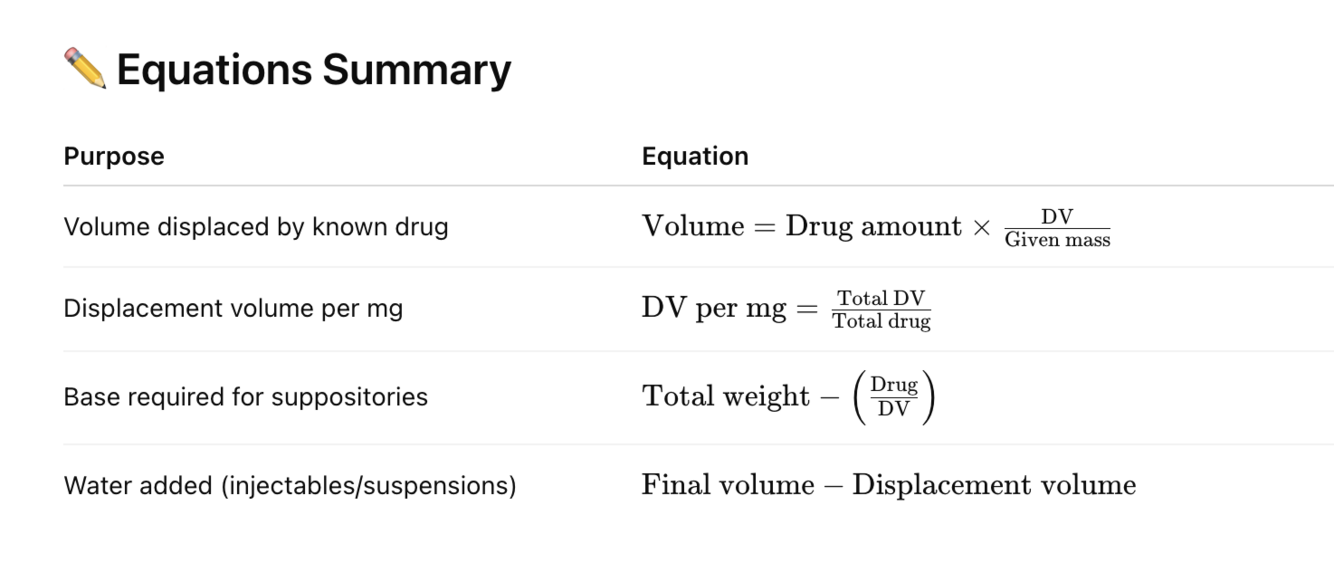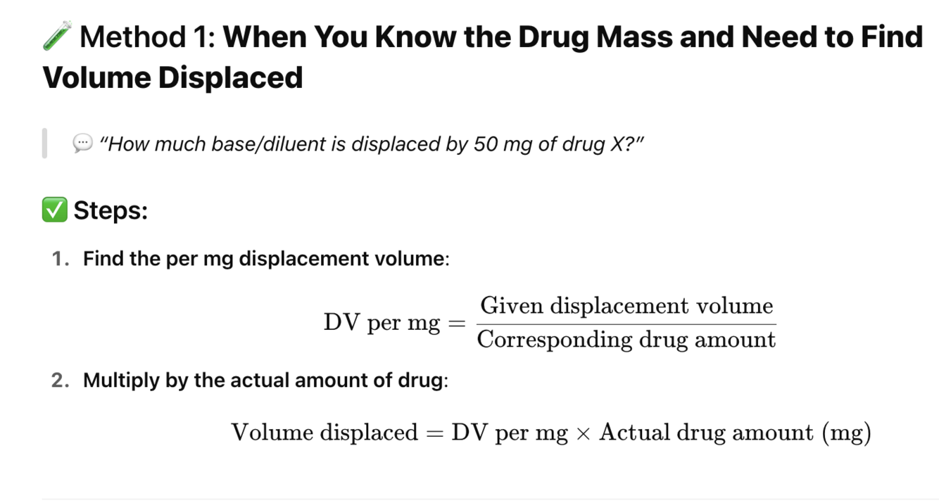 displacement by drug = total mass of DRUG divided by DISPLACEMENT VALUE