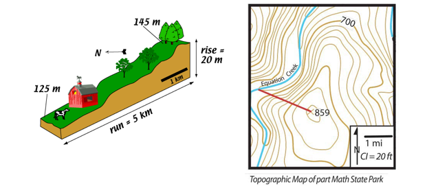 In the topographic map figure on the right, realize that “Rise” is the difference in elevation from the top to bottom. So determine the elevation of the top of the hill (859 feet) and subtract the elevation at the bottom of the run at Equation Creek (note that CI = Contour interval), so the elevation change is 859 feet – 680 feet or 179 feet. The “Run” is the horizontal distance from the top elevation to the