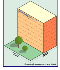 EXAMPLE: Using the same figure used earlier for the floor area ratio calculation, let’s start with the assumption that each of the eight floors of the building contains six residential units, or 48 dwelling units overall in the building. The lot area is 200 feet x 200 feet = 40,000 square feet or 0.9183 acre (i.e. 40,000 square feet / 43,560 square feet per acre = 0.9183 acre).