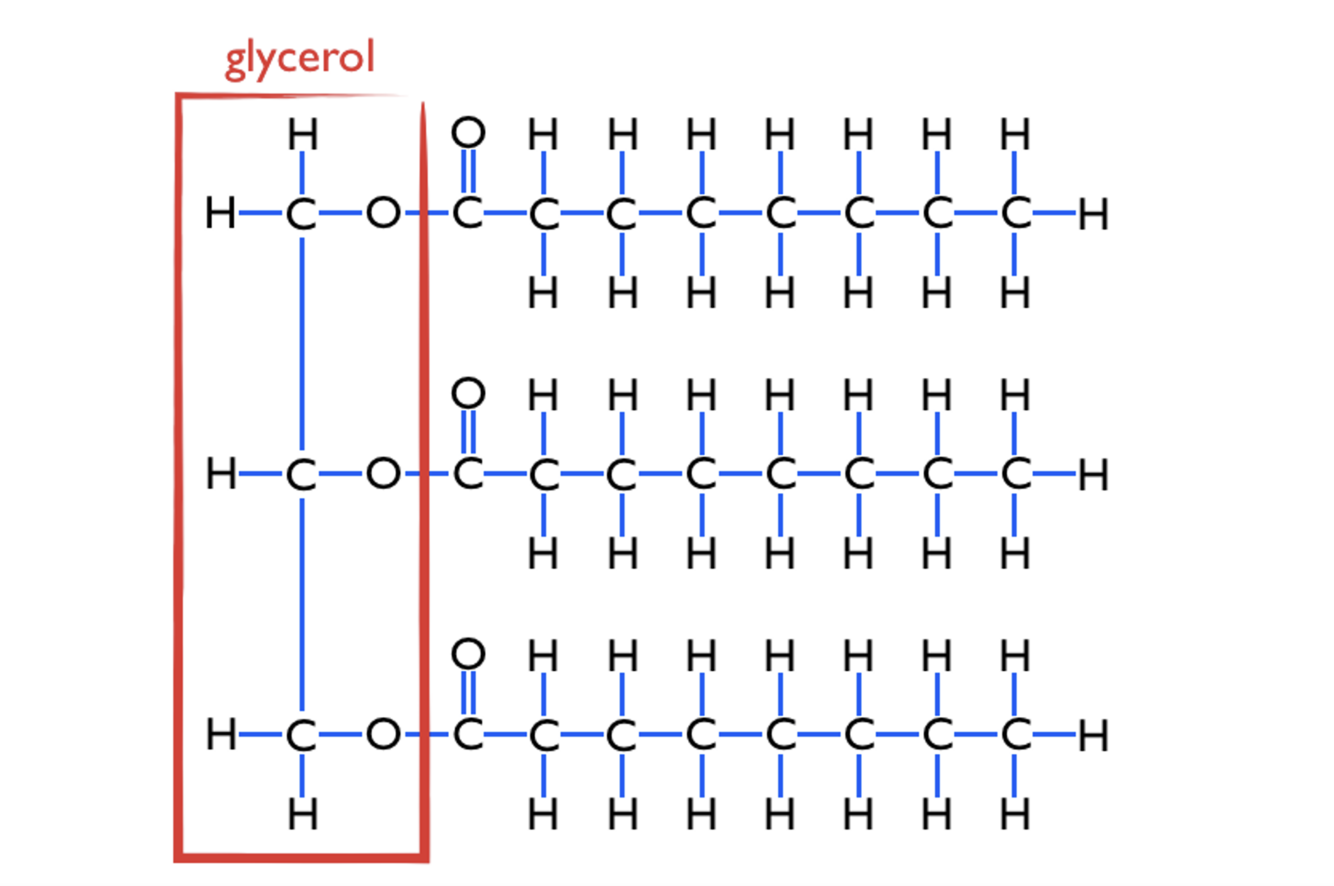 one molecule of glycerol joined by Ester bonds to three fatty acids.