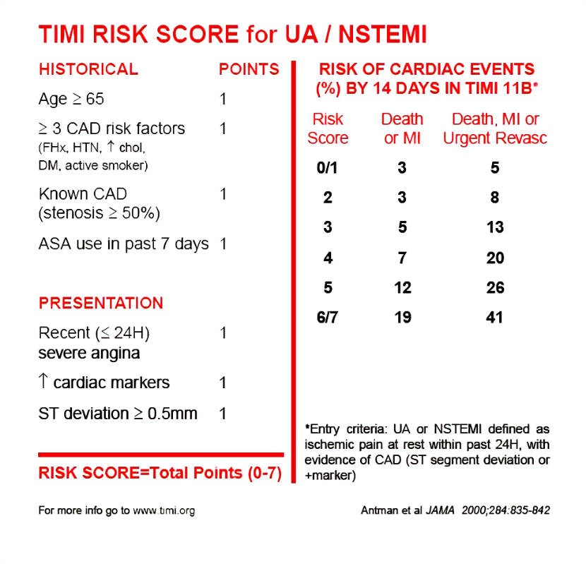 TIMI derived from pt with known unstable angina/NSTEMI to determine risk of MACE in 2 weeks and whether a pt may be eligible for otpt management