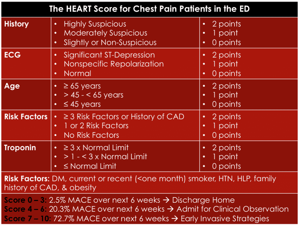 Risk stratification with UNDIFFERENTIATED chest pain in pts >/= 21yrs for risk of MACE at 6 weeks