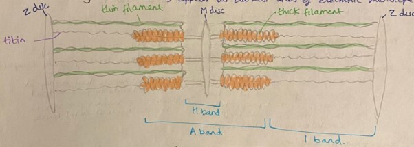 many organised in parallel and connected to cytoskeleton of the cell. means that during contraction when actin is pulled across myosin, the sarcomere shortens and this is transmitted throughout the whole cell, shortening the muscle fibre.
