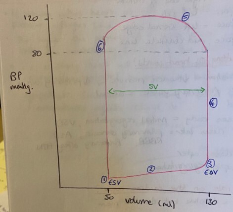4 - SL valves open + rapid ejection- continued rise in ventricular pressure but starts to curve round. aortic pressure rises as blood ejected out.