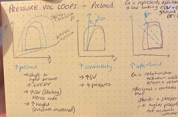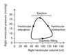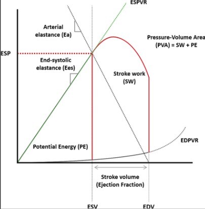 for ESV curve - as volume in heart at end of systole increases, so does pressure. the steeper this relationship, the better the contractility i.e. a good heart will remain maximally contracted at end of systole and increase pressure, whereas weak heart will stretch with added volume, reducing efficiency of contraction.