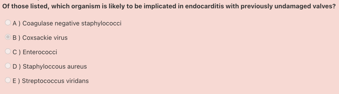 The presentation of acute infective endocarditis depends on the virulence of the pathogen. Virulent organisms (s. aureus, beta-haemolytic streptococci, pneumococci) attack previously normal cardiac valves and present with a high fever, produce embolic abscesses, and rapidly destroy cardiac structures. Non-virulent organisms (s. viridans, enterococci, coagulase negative staphylococci) tend to produce a more indolent illness, with a low grade fever, and little destruction of cardiac structures.