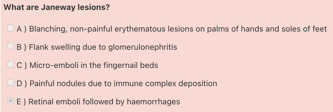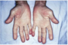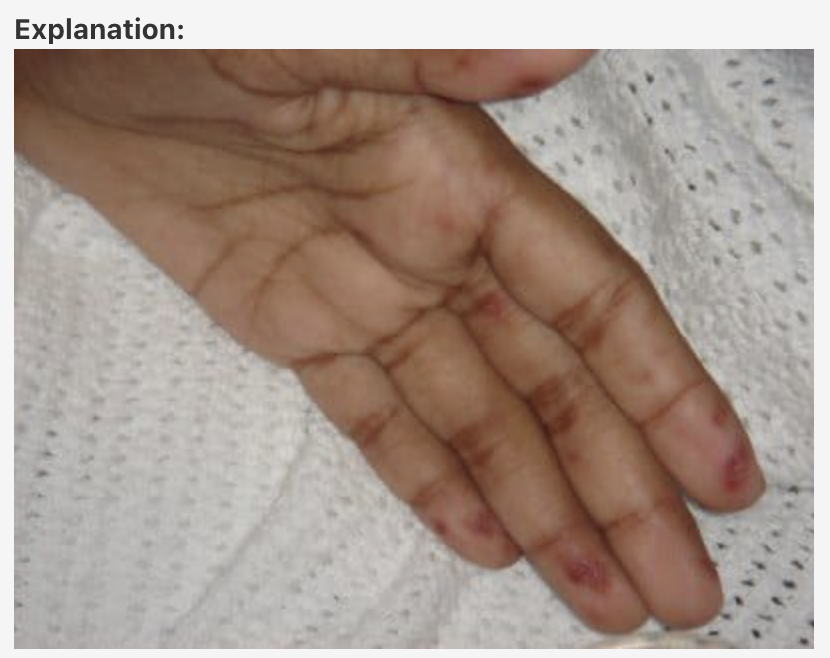 Answer: Blanching, non-painful erythematous lesions on palms of hands and soles of feet