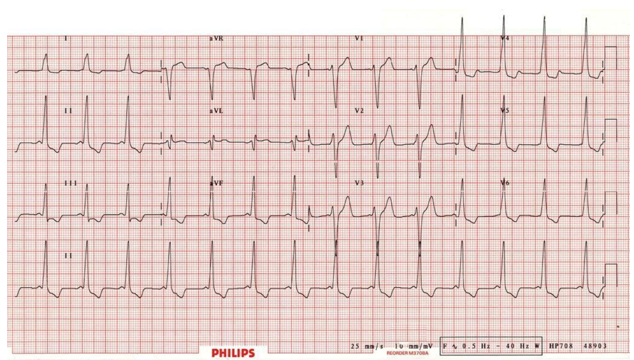 B. Pericarditis with likely cardiac tamponade (normal pulsus paradoxus drop is <10mmHg)