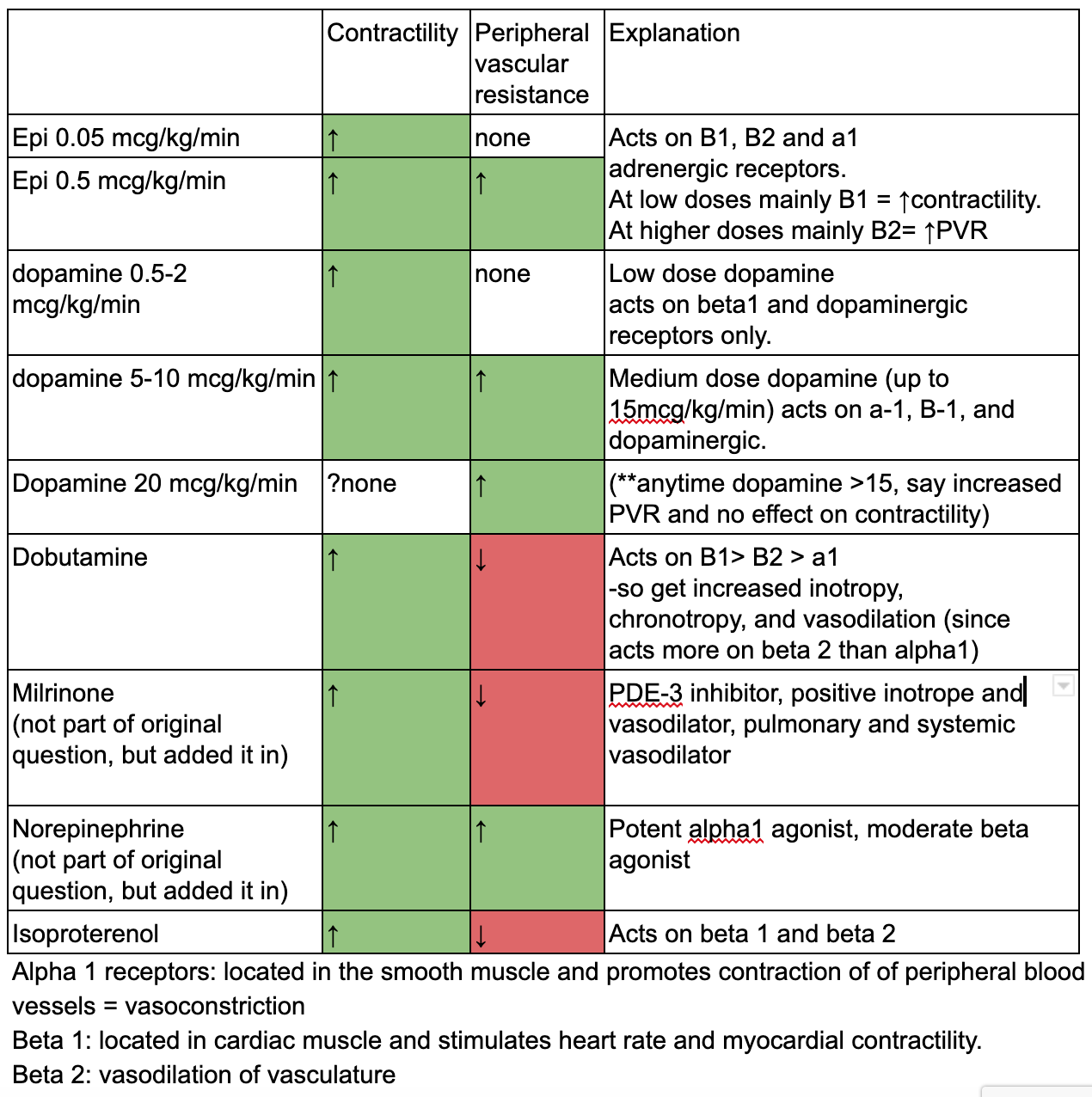Table given with medications. Write “increase” “decrease” or “none” for effect of the following on (a) contractility and (b) PVR