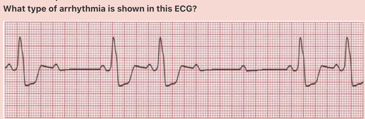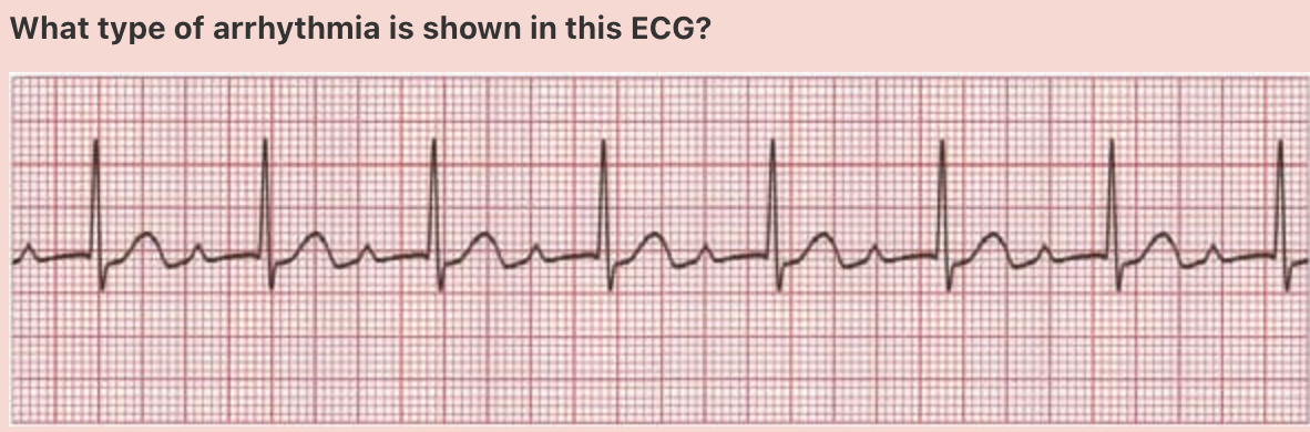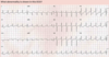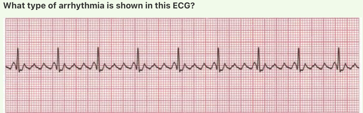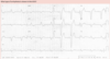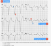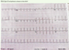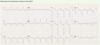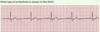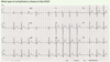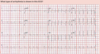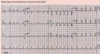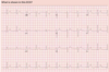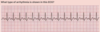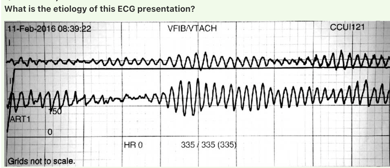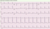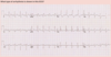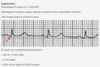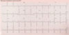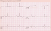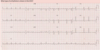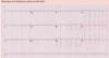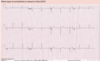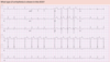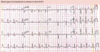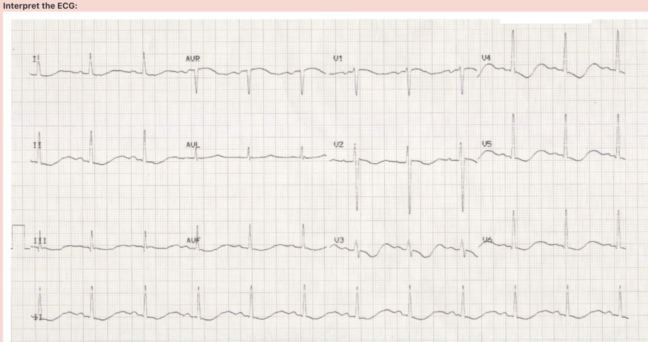 Note the presence of a U wave, with the associated flattened T wave. The merging of the T wave and the U wave is often misinterpreted as a prolonged or wide QRS; don’t fall for this common student trap! Also note the depressed ST segment, especially marked in Lead II. Causes of hypokalaemia include anorexia, chronic alcohol use, gepphagia, alkalosis, and thiazide/loop diuretics (among others).