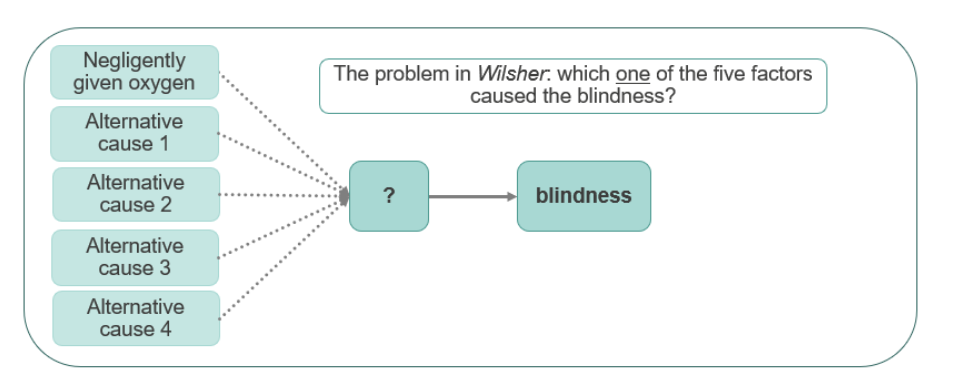 Wilsher v Essex - baby born prematurely and blindness could have been caused by 5 different factors (only 1 of which - excess oxygen - was tortious), evidence showed that one factor was solely responsible for this - C had to establish that it was more likely than not (more than 50% chance) that blindness caused by breach rather than other factor, but C could only prove 20% chance so claim failed