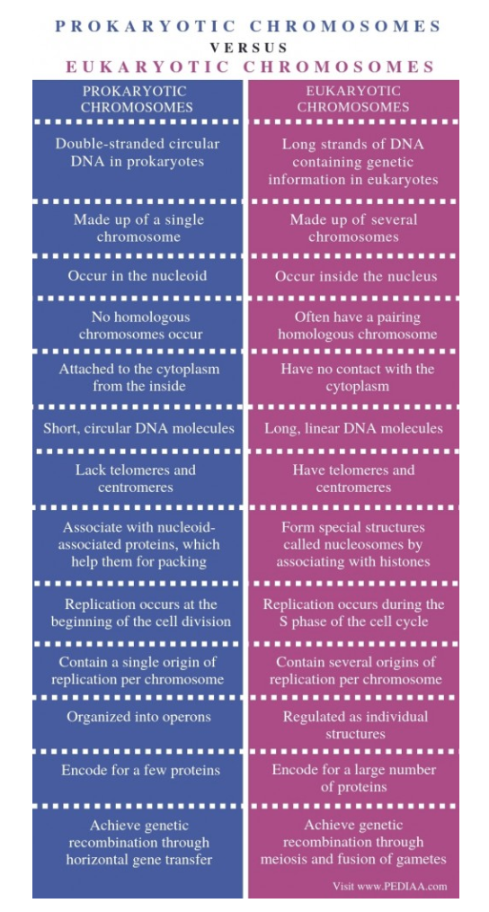 List three differences between the chromosome of a bacterial cell and a eukaryotic cell