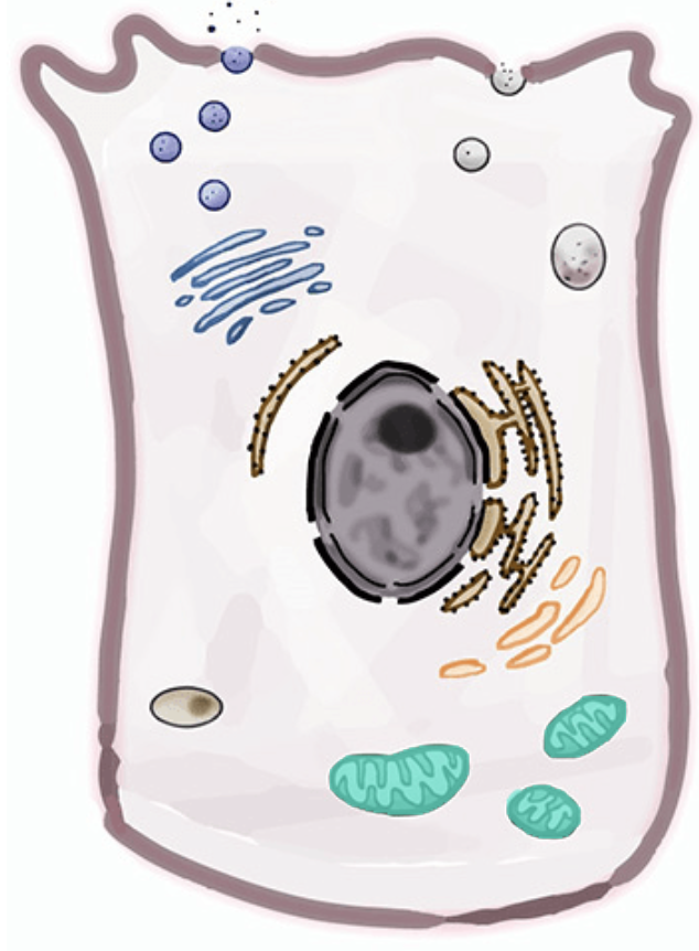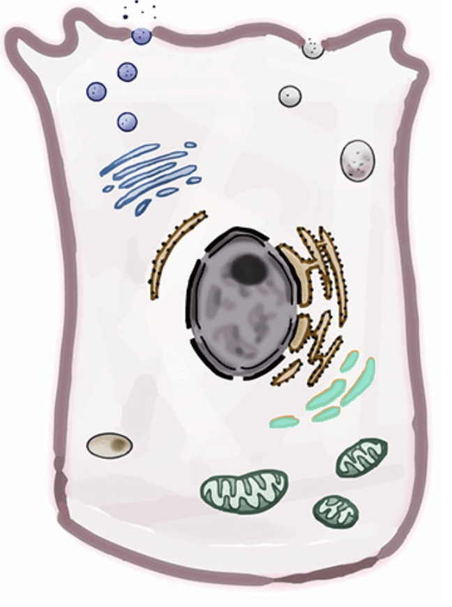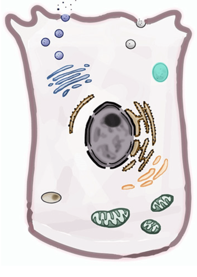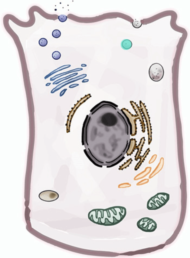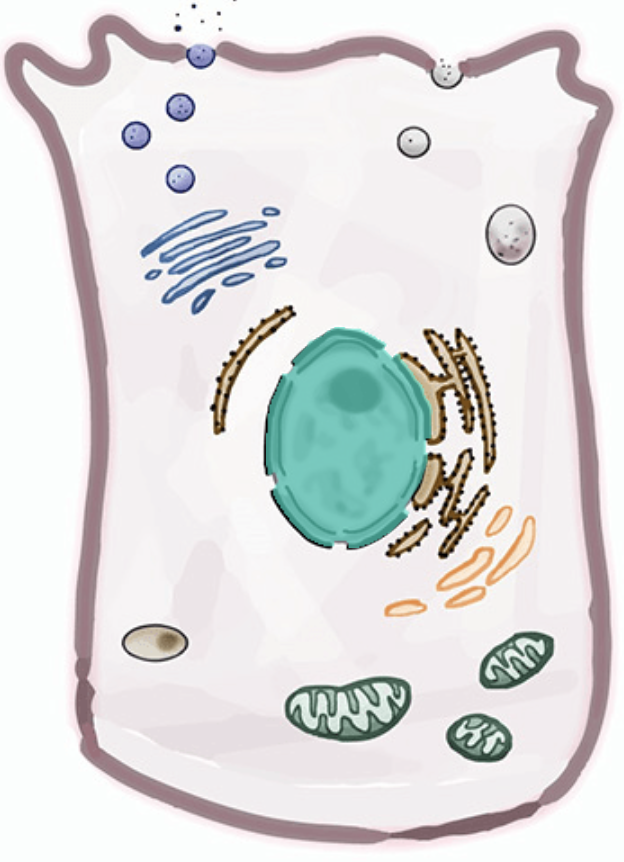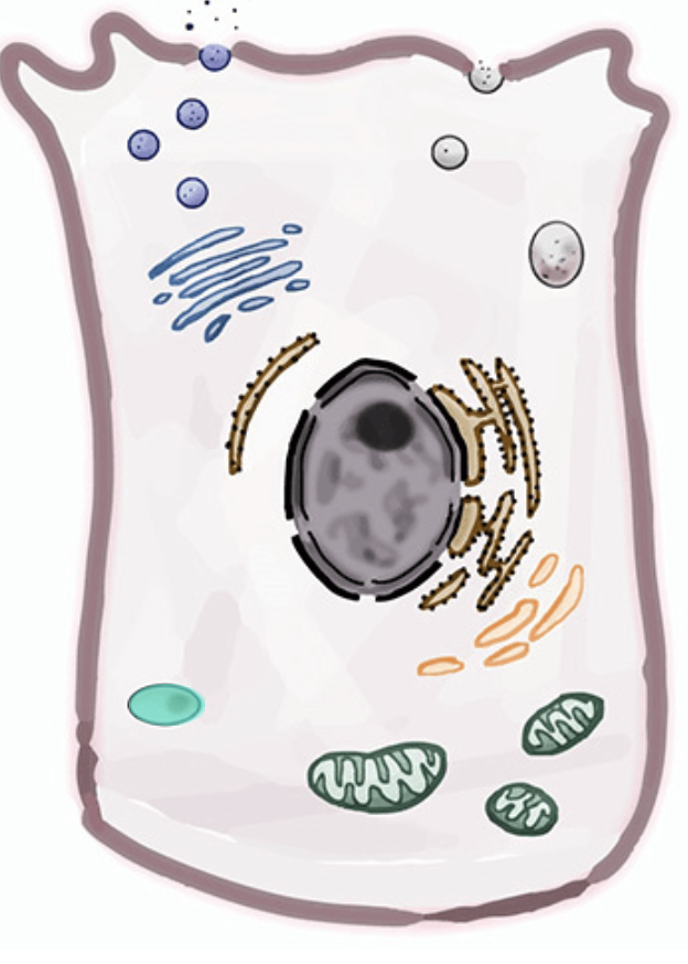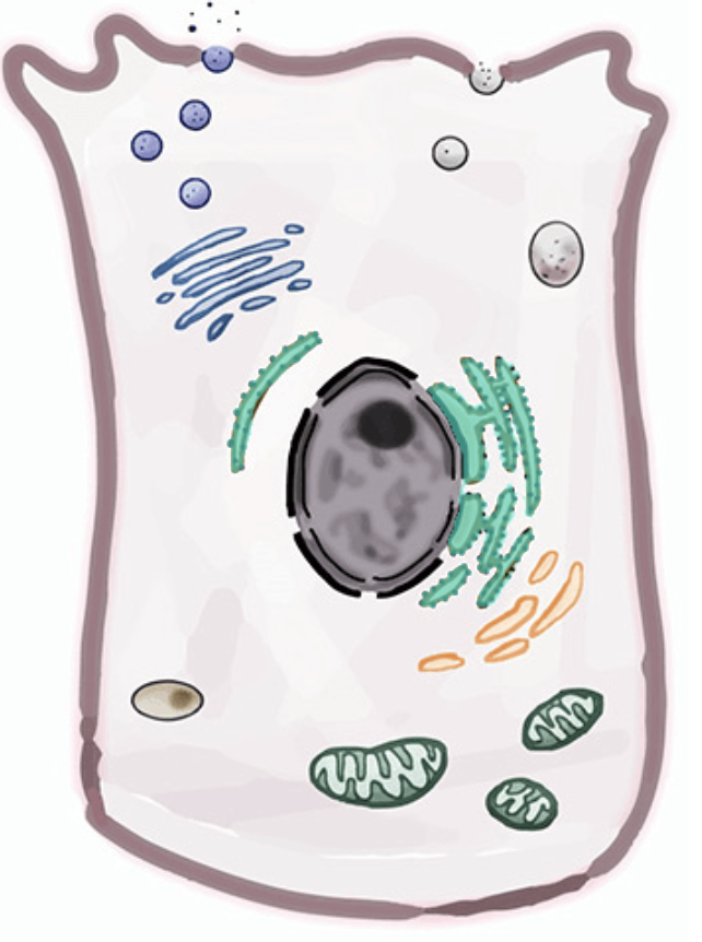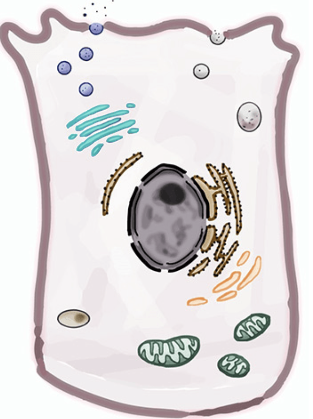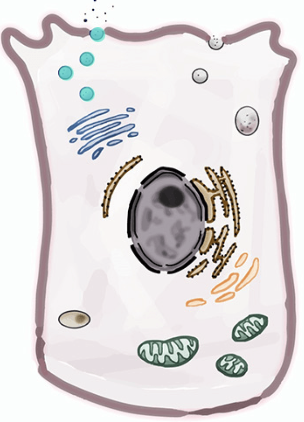 De secretory granules. Tijdelijke opslag van secretie proteïnen die een bestemming buiten de cel hebben. Ronde structuren die uit het golgi apparaat komen, en pas hun inhoud uitscheiden na een specifiek signaal.