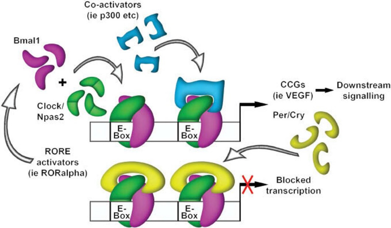 CLOCK/BMAL1 → PER/CRY ger dygnsvariation i genuttryck → ändrad jonkanalsaktivitet → SCN-neuroner fyrar rytmiskt → detta är signalen från hypotalamus till resten av hjärnan/kroppen.