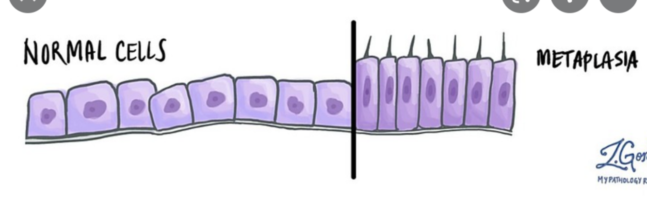 The basic cell type of the endocervix is columnar epithelial cells that secrete mucus. If the columnar epithelial cells are exposed to the acidic pH of the vagina they undergo metaplasia, which is the change from one cell type to another (columnar to squamous). Alternatively, if a patient is infected with human papillomavirus (HPV), what can happen to the cells of the cervix?
