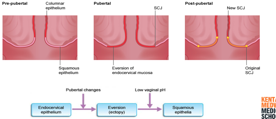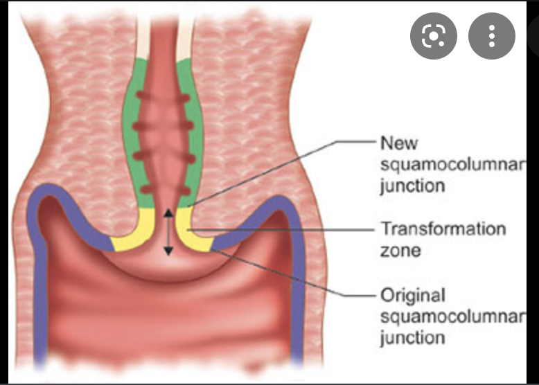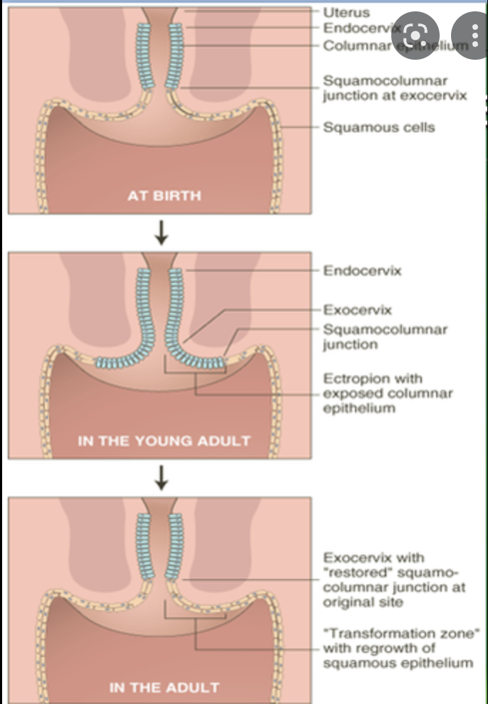 Metaplasia is the term used to describe when one cell type changes into another, and this occurs when the columnar cells become squamous cells when exposed to the acidic vaginal pH. This causes the the squamocolumnar junction (where endocervical (columnar) and ectocervix (squamous) meet to move throughout a woman’s life. What is the movement of the squamocolumnar junction called?