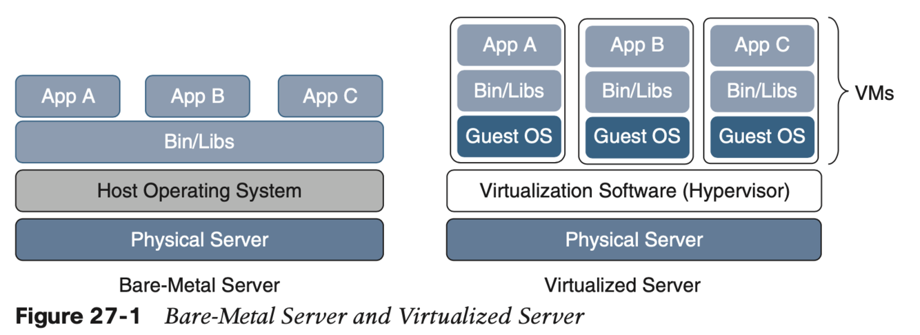 Figure 27-4 shows a side-by-side comparison of VMs and containers. Notice that each VM requires an OS and that containers all share the same OS while remaining isolated from each other.