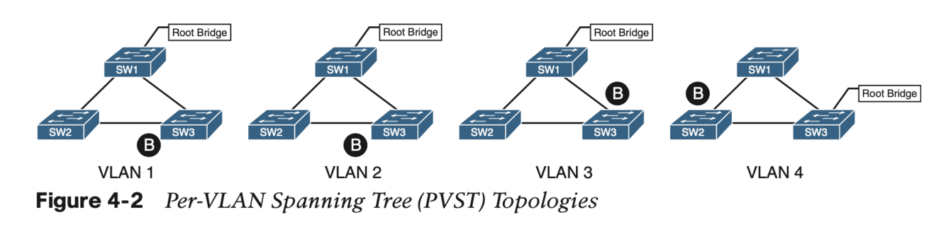 Cisco developed the Per-VLAN Spanning Tree (PVST) protocol to allow for an STP topology for each VLAN. With PVST, the root bridge can be placed on a different switch or can cost ports differently, on a VLAN-by-VLAN basis. This allows for a link to be blocked for one VLAN and forwarding for another.