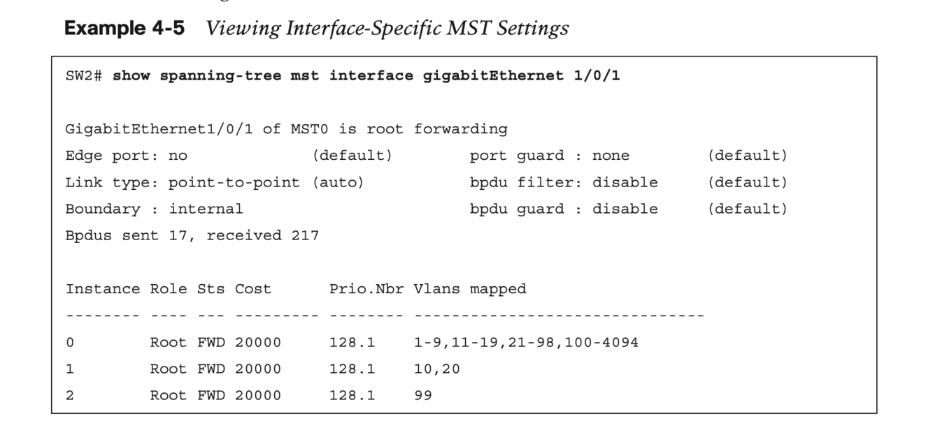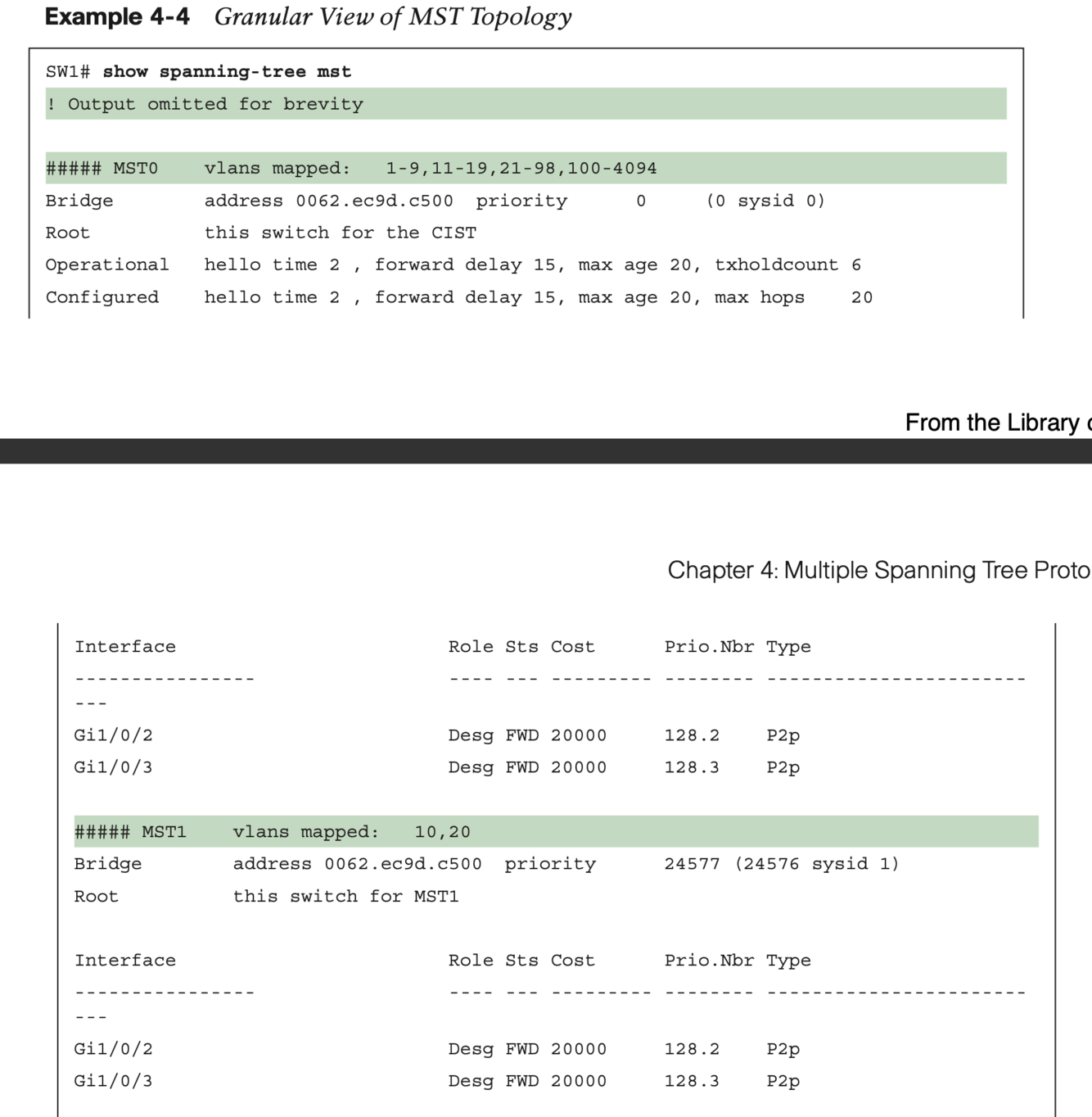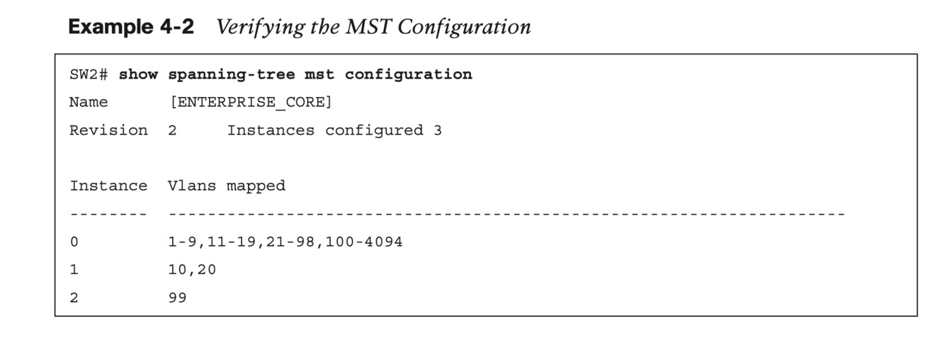 Example 4-2 shows the output. Notice that MST instance 0 contains all the VLANs except for VLANs 10, 20, and 99, regardless of whether those VLANs are configured on the switch. MST instance 1 contains VLAN 10 and 20, and MST instance 2 contains only VLAN 99.