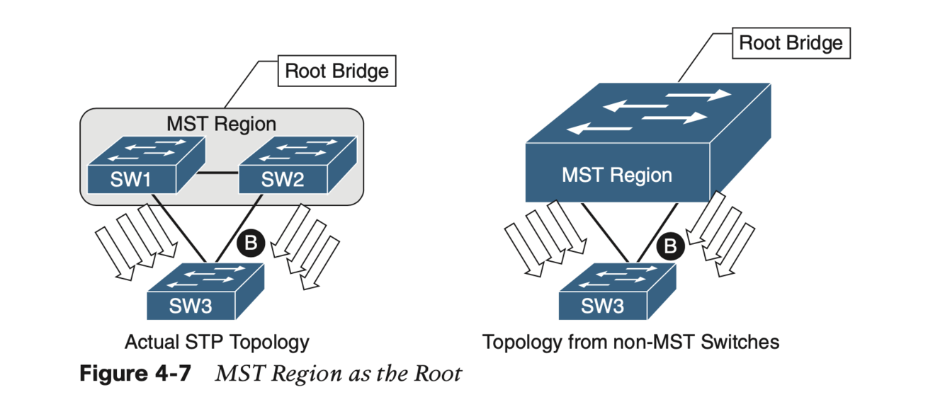 The topology for all the MST instances is contained within the IST, which operates internally to the MST region. An MST region boundary is any port that connects to a switch that is in a different MST region or that connects to 802.1D or 802.1W BPDUs.