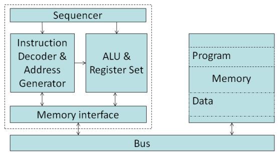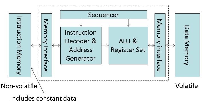 It has separate memory blocks for the programme instructions and the data with separate data and address buses.
