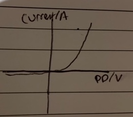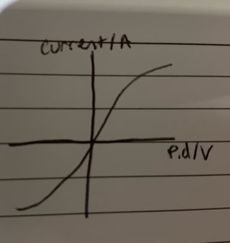 Current increases proportionally with V at low V. Increase in current causes increase in temperature (causing particles in metal to vibrate more so makes it harder for charge to flow) which increases resistance, so current decreases again. Graph levels off at high currents (rate of increase of I with V decreases)