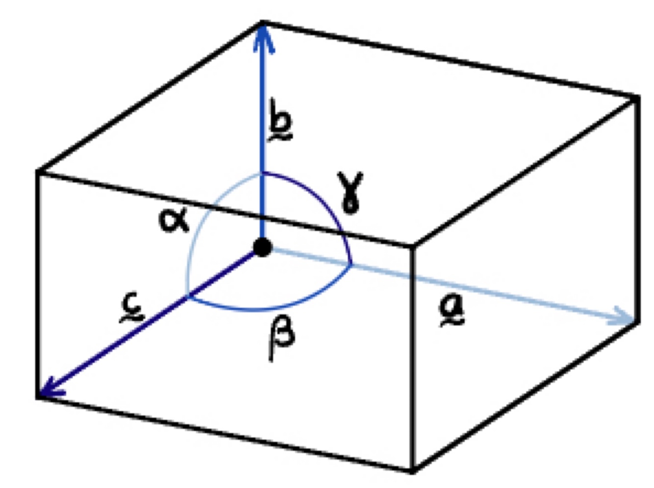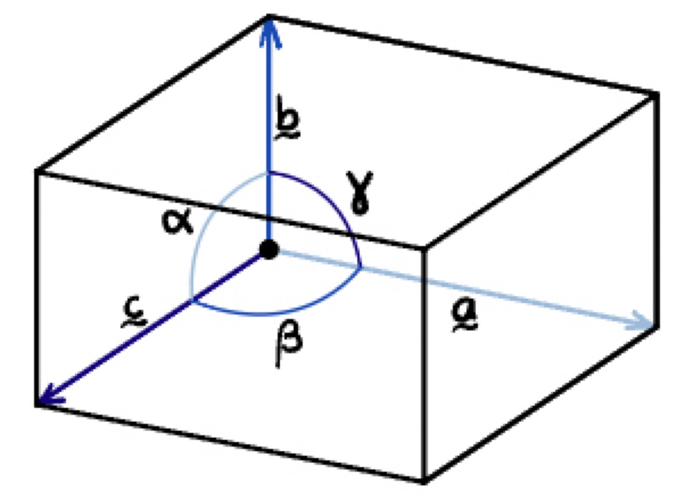 The basic element on the structure of a crystal, due to its periodic structure. They are characterised by three vectors, a, b, c, and three angles, α, β, γ.