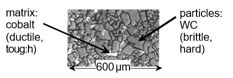 What are the matrix/particle components in WC/Co cemented carbide?