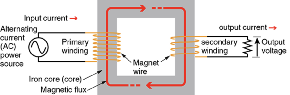 The alternating current in the primary coil produces a changing magnetic field which links the secondary coil via the soft iron core. This changing magnetic field induced an emf in the secondary coil.