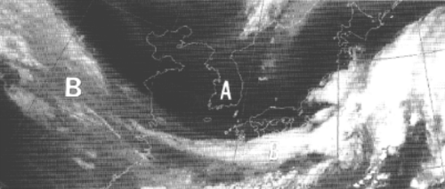 A dark region (A in Figure) indicates an area of high temperature and the dryness of the upper and middle air there.