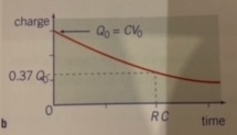 At time t = RC after the start of the discharge, the charge falls to 0.37 (e^-1) of it’s initial value