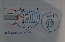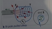 Induced S-pole at end X of the coil due to opposing the magnet moving away, so induced current passes around X in a clockwise direction