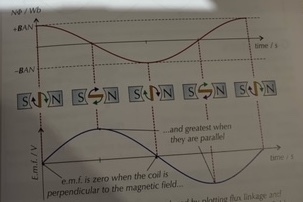 Flux linkage giiven by BANcos(theta) and as the coil rotates, theta changes - so the flux linkage varies sinusoidally between +BAN and -BAN