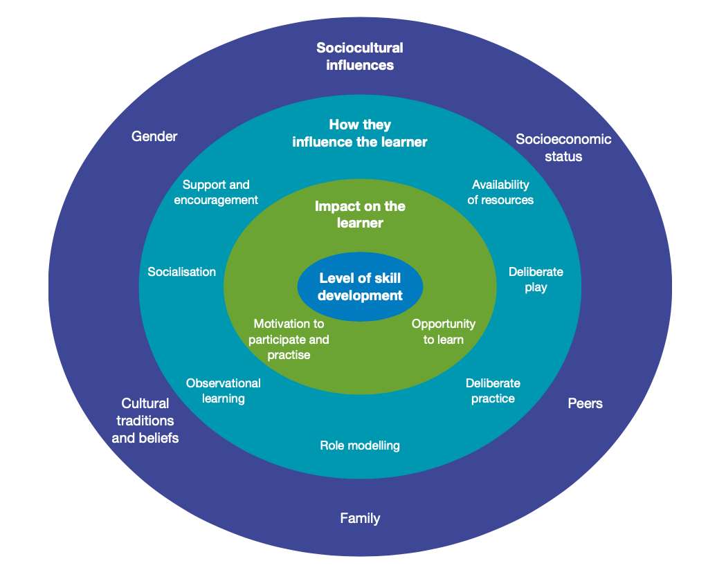 combination of social and cultural factors that impact an individual’s opportunities to participate in particular sports or recreational activities and, in turn, develop the relevant movement skills
