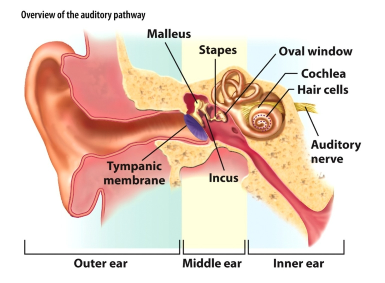 the outer, middle, and inner ear. They provide the mechanisms for transforming sounds (variations in sound pressure) into neuronal signals