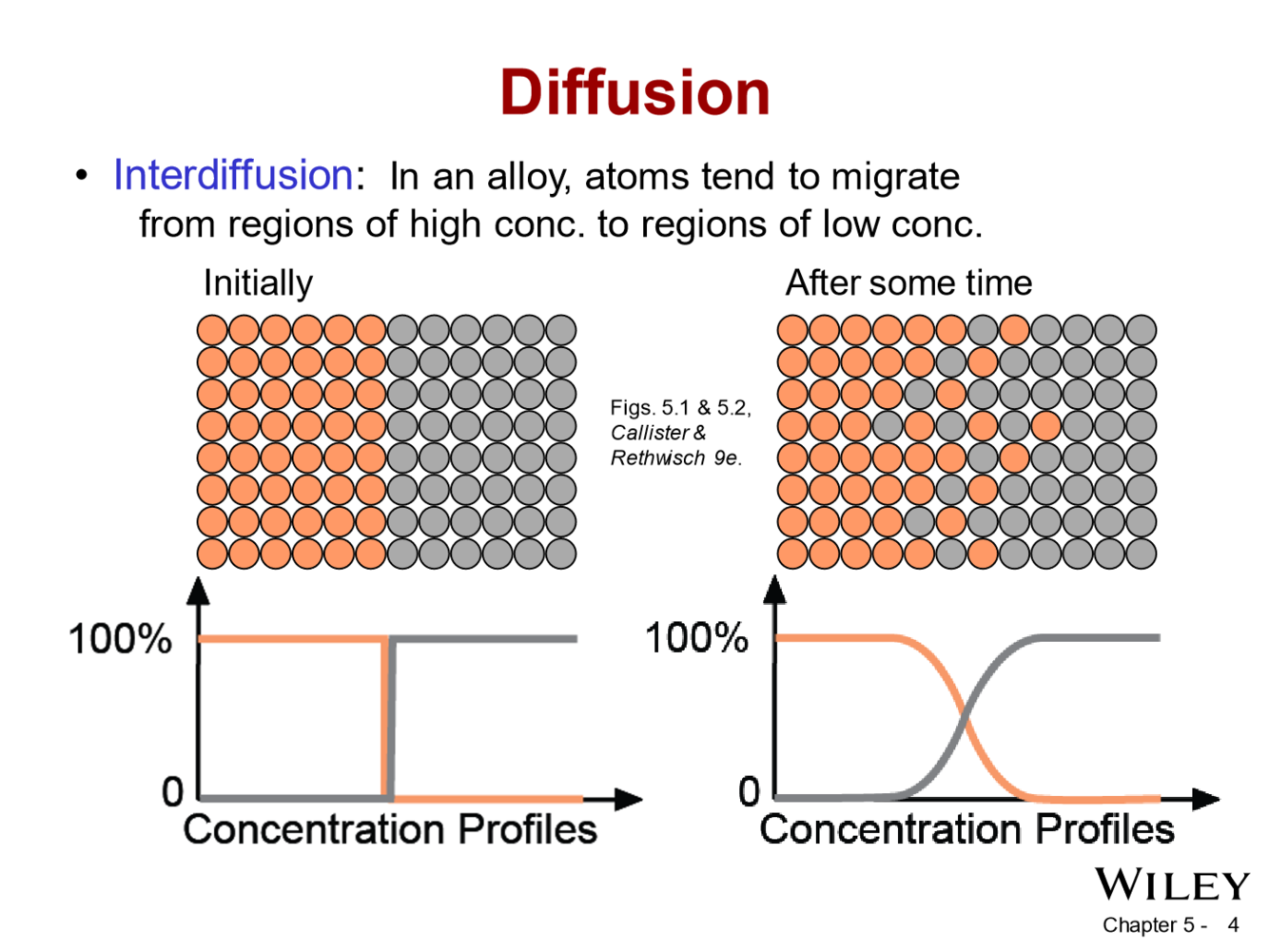 In pure metals self-diffusion occurs where there is no net mass transport, but atoms migrate in a random manner throughout the crystal. In alloys inter-diffusion takes place where the mass transport almost always occurs so as to minimize compositional differences.