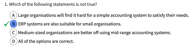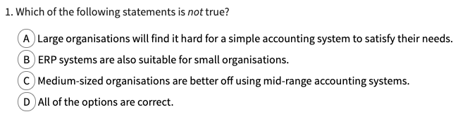 Which of the following statements regarding accounting systems is not true is not true? a. Large organisations will find simple accounting system hard to satisfy their needs. b. ERP systems are also suitable for small organisations. c. Medium-sized organisations are better off using mid-range accounting systems. d. None of the options is correct.