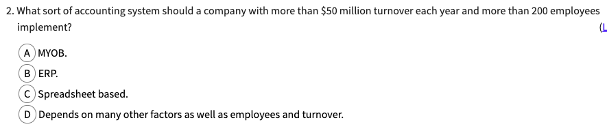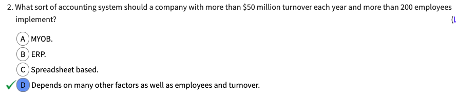 Which of the following statements regarding accounting systems is not true is not true? a. Large organisations will find simple accounting system hard to satisfy their needs. **\*b. ERP systems are also suitable for small organisations.** c. Medium-sized organisations are better off using mid-range accounting systems. d. None of the options is correct.