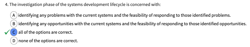 Customers complain to an organisation about a system that bills them incorrectly. As a result, the organisation decided to implement a new billing system. This is an example of identifying system development opportunities through: **\*a. user and stakeholder feedback.** b. a periodic review of system operations. c. observing the system in action by watching users. d. all the options are correct.