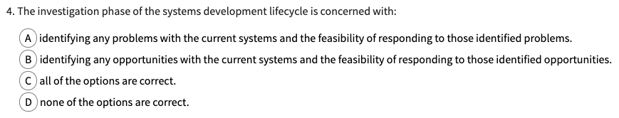 Why is the system development lifecycle (SDLC) called a ‘lifecycle’? **\*a. Once maintenance can no longer keep the system effective the process restarts from the beginning of investigation.** b. The resulting system will last for the whole life of the company. c. The new system evolves and grows like a living organism. d. If changes are required, it is easy to cycle round the stages again.