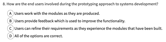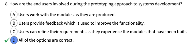 How are the end users involved during the prototyping approach to systems development? a. Users work with the modules as they are produced. b. Users provide feedback which is used to improve the functionality. c. Users can refine their requirements as they experience the modules that have been built. **\*d. All the options are correct.**