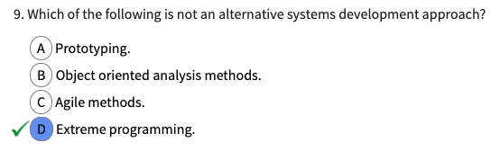 Which of the following is not an alternative systems' development approach? a. Prototyping. b. Agile methods. **\*c. Extreme programming.** d. All the above.
