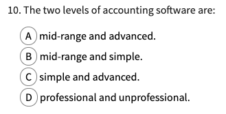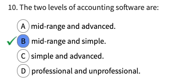 The two levels of accounting software are: a. mid-range and advanced. **\*b. mid-range and simple.** c. simple and advanced. d. professional and unprofessional.