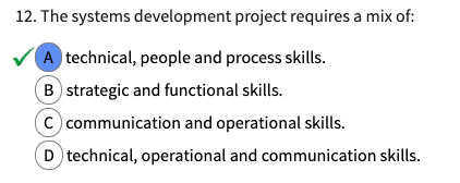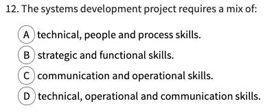 The systems' development project requires a mix of: **\*a. technical, people, and process skills.** b. strategic and functional skills. c. communication and operational skills. d. technical, operational, and communication skills.