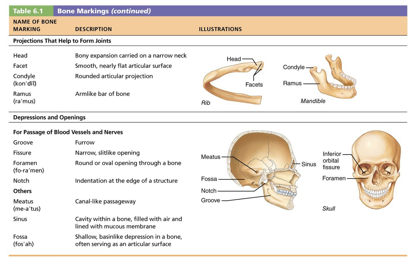 Bone markings are areas involved in joint location or conduits for blood vessels and nerves.