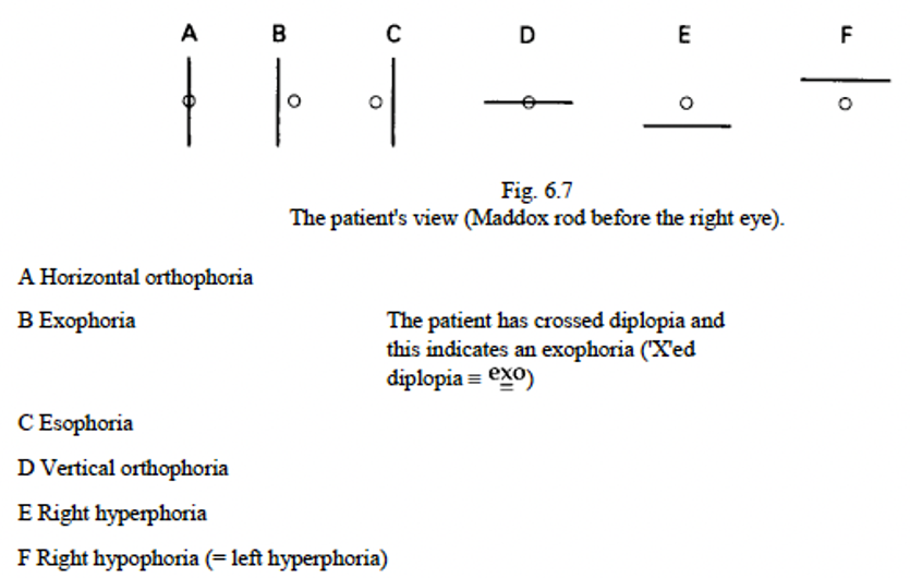 it must be far enough away for its rays to be parallel on reaching the patient (at least 6m); Maddox rod is close to eye in the trial frame