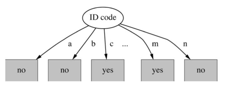Entropy of split = 0 (since each leaf node is “pure”), having only one case. Information gain is maximal for ID code