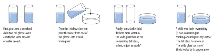 • Centration: focus on one aspect and neglect others (e.g., height of liquid not volume)