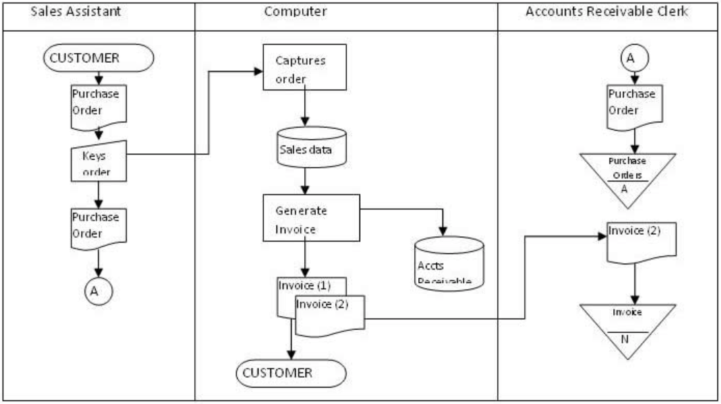 d. The sales assistant receives a purchase order and keys the data into the computer, which captures the data in the sales file. This data is used to prepare two invoices, one of which is sent to the customer. The second copy of the invoice is sent to accounts receivable clerk, who files the document. The sales assistant forwards the purchase order to the accounts receivable clerk, who files the document away.