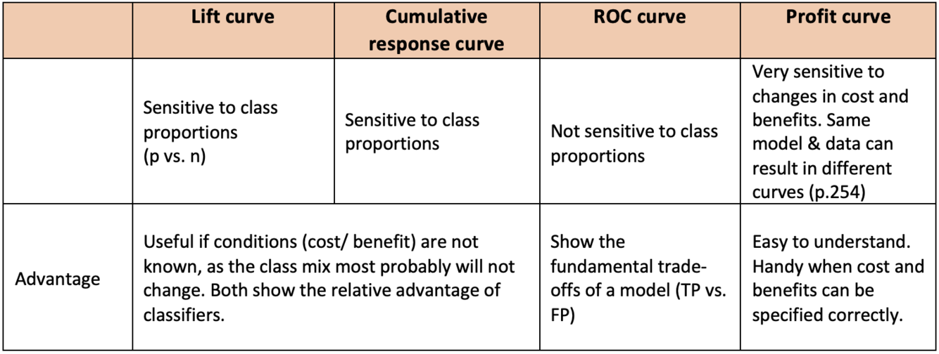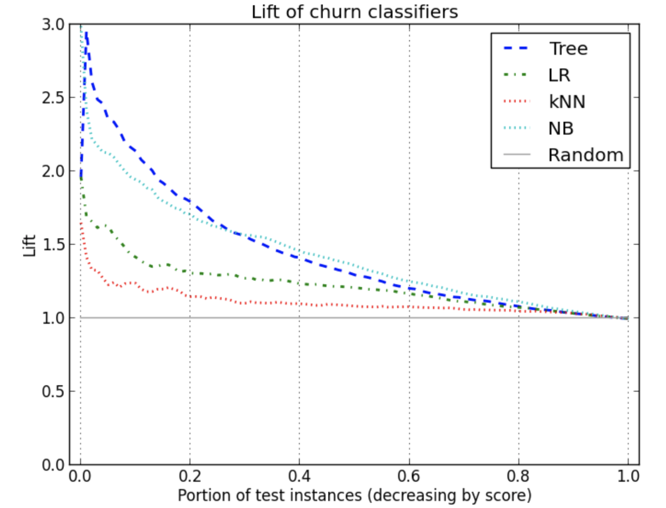 Looking at this graph, if you wanted to target the top 25% or less of customers, you’d choose the classification tree model; if you wanted to go further down the list you should choose NB.